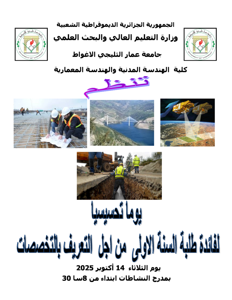 كلية الهندسة المدنية و الهندسة المعمارية:إعلان عن يوم تحسيسي خاص بطلبة سنة الأولى لتعريف بالتخصصات يوم الثلاثاء 14 أكتوبر2025