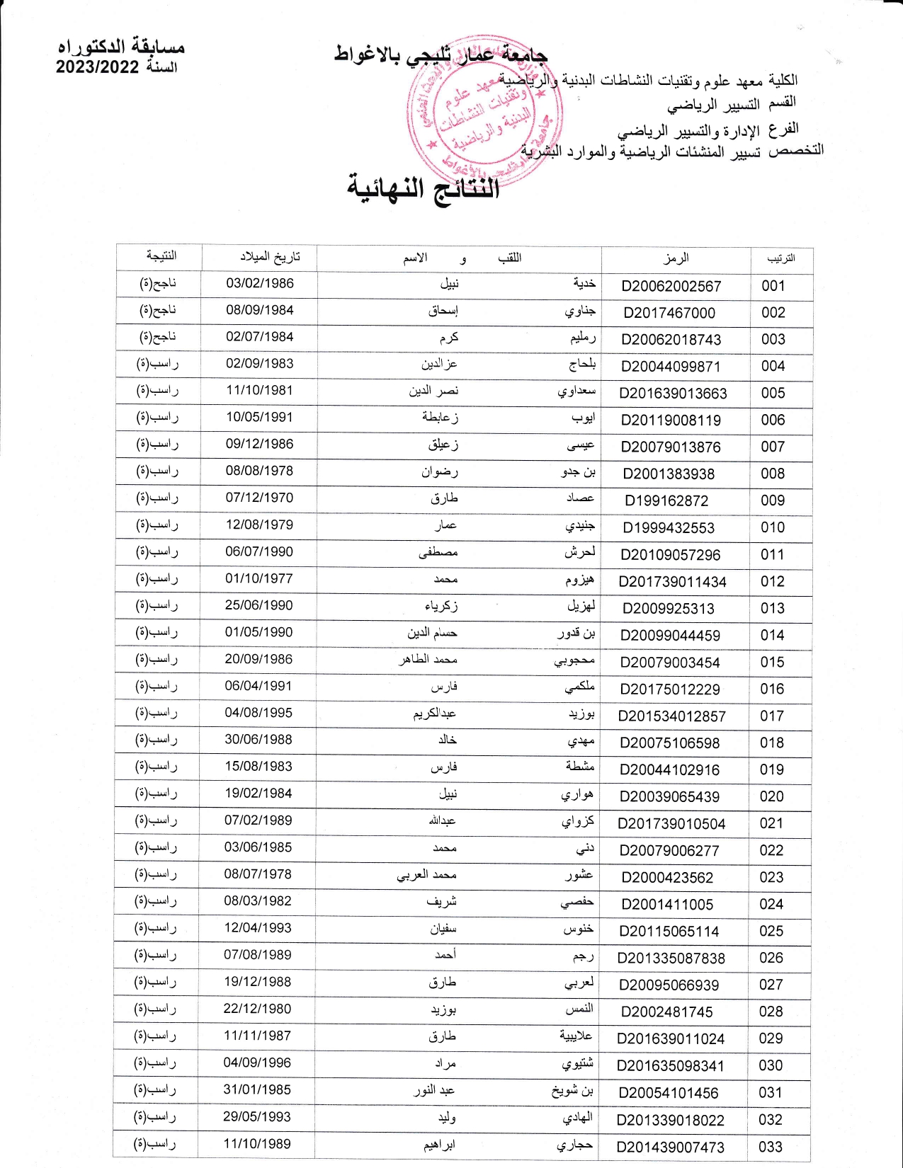 التخصص: تسيير المنشآت الرياضية والموارد البشرية
