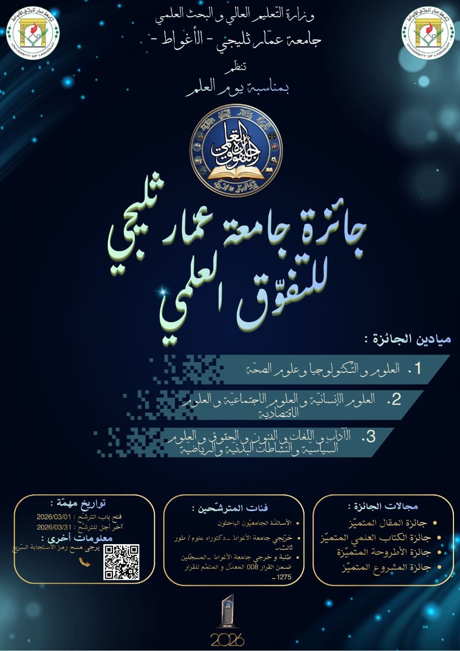 جائزة الأطروحة المتميزة | الدكاترة خريجي جامعة الأغواط (دكتوراه علوم و ل.م.د) | العلوم الإنسانية والاجتماعية والاقتصادية | جائزة واحدة لكل ميدان | اضغط هنا لتحميل الشروط |
