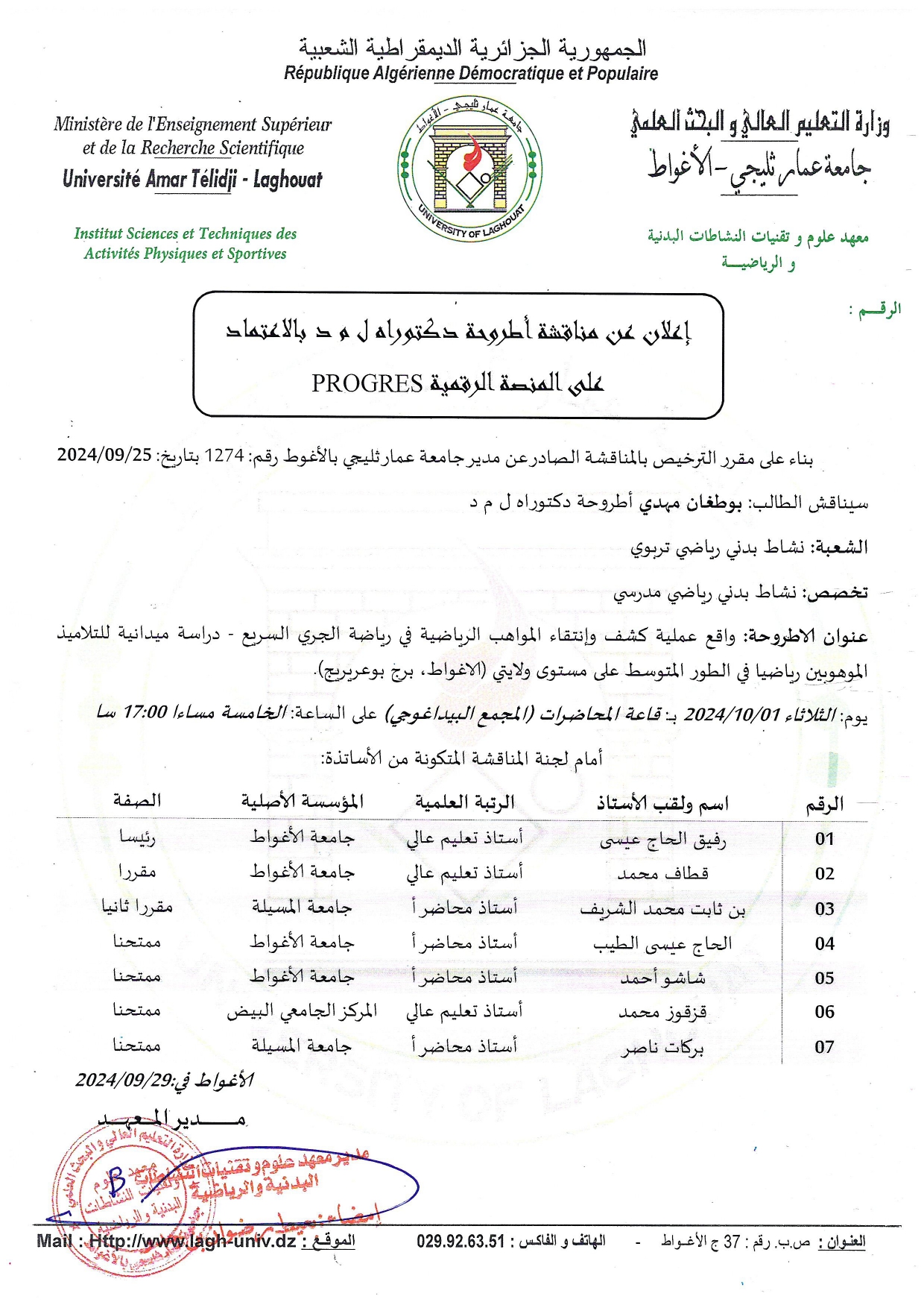 إعلان عن مناقشة أطروحة (ل م د) بالإعتماد على المنصة الرقمية PROGRES