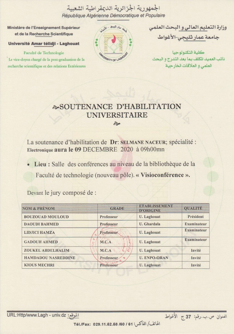 Faculty of technology : An invitation to discuss the university habilitation of dr. SELMANE NACEUR, Department of Electronics